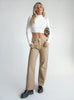 - Taupe washed, belt looped waist, button & zip closure, five pockets, raw edge hem, branded patch at back