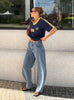 - Blue washed, belt looped waist, button & zip closure, five pockets