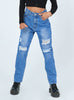 • Mid-washed, belt looped waist, button & zip closure, five pockets, distressed ripped detail, branded patch at back