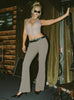 - Flared leg, belt looped waist, clasp and button fastening, twin hip pockets