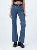 - Dark-washed, belt looped waist, button & zip closure, five pockets, branded patch at back