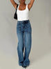 • Blue washed, belt looped waist, button & zip closure, four pockets, branded patch at back