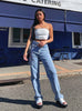 - Light washed, belt looped waist, button & zip closure, five pockets